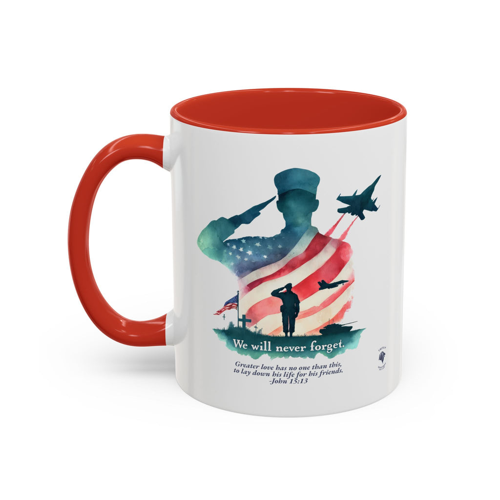 Two Never Forget patriotic Christian mugs on wooden counter with American flag and red white blue flowers – John 15:13 Bible verse