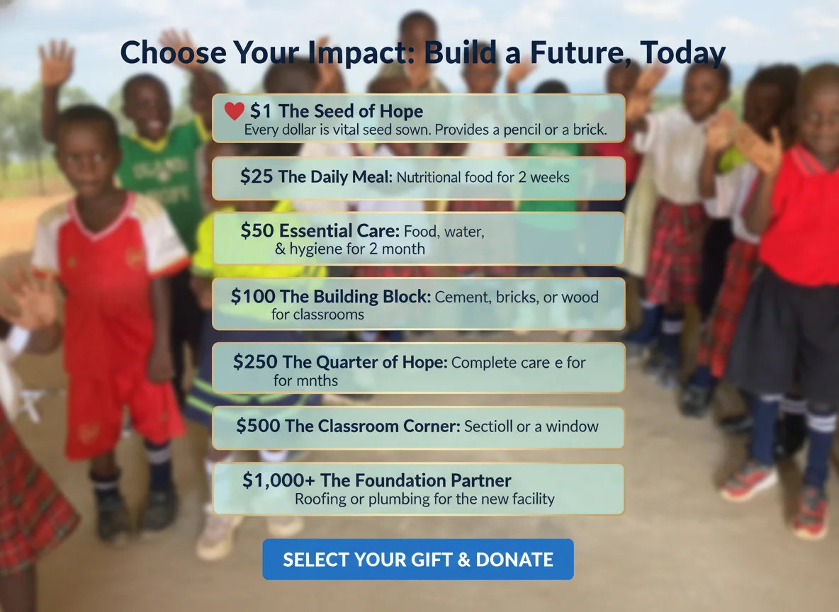 We believe in direct action and absolute clarity. When you choose a partnership level below, you are not just donating; you are funding a specific, tangible piece of safety, nourishment, and education for 2,000 vulnerable children in Uganda.