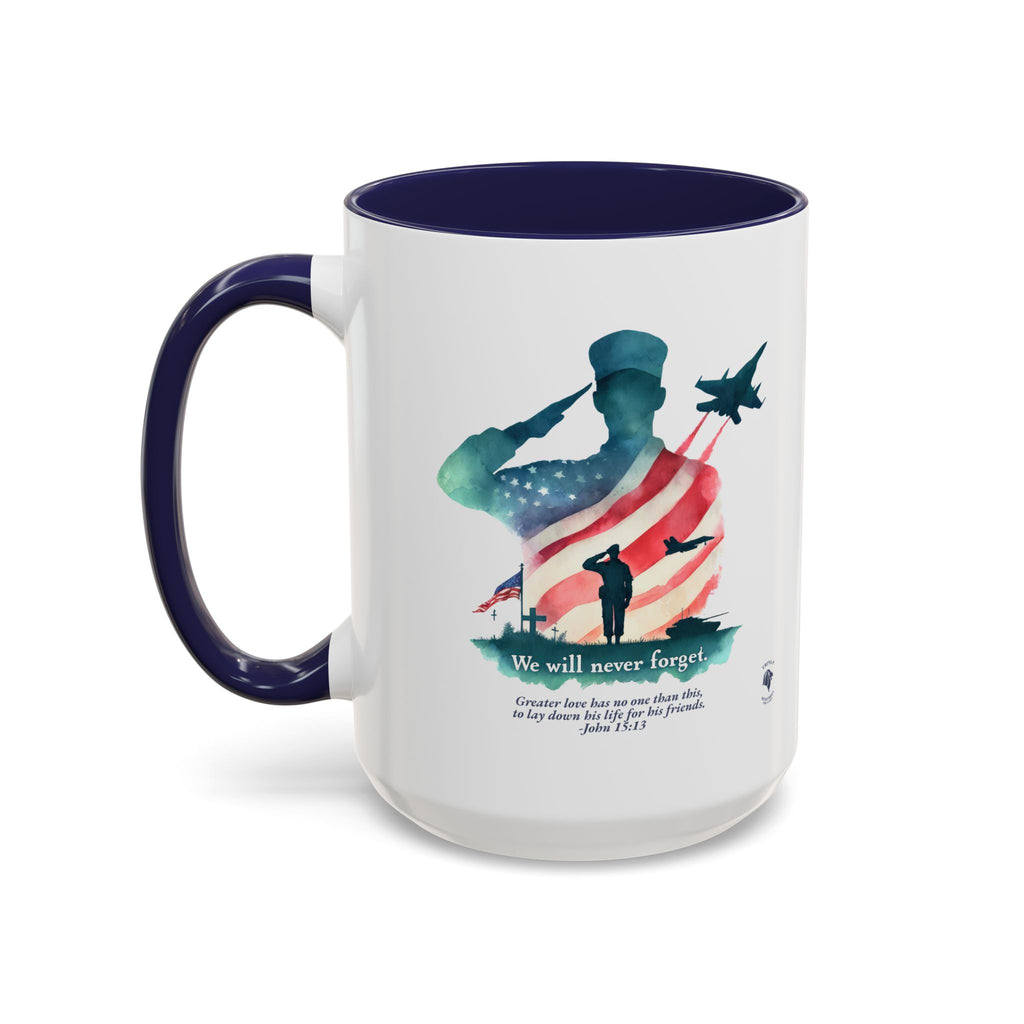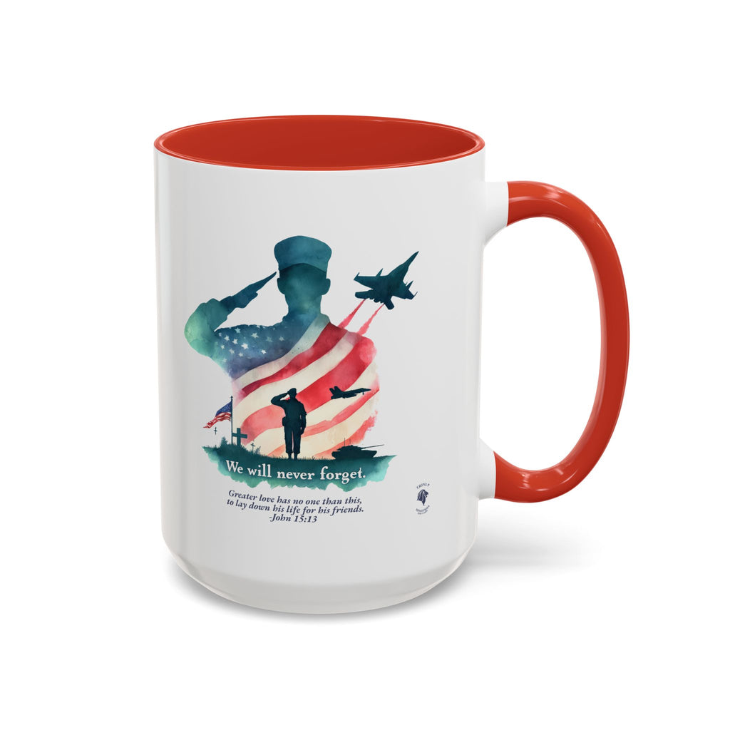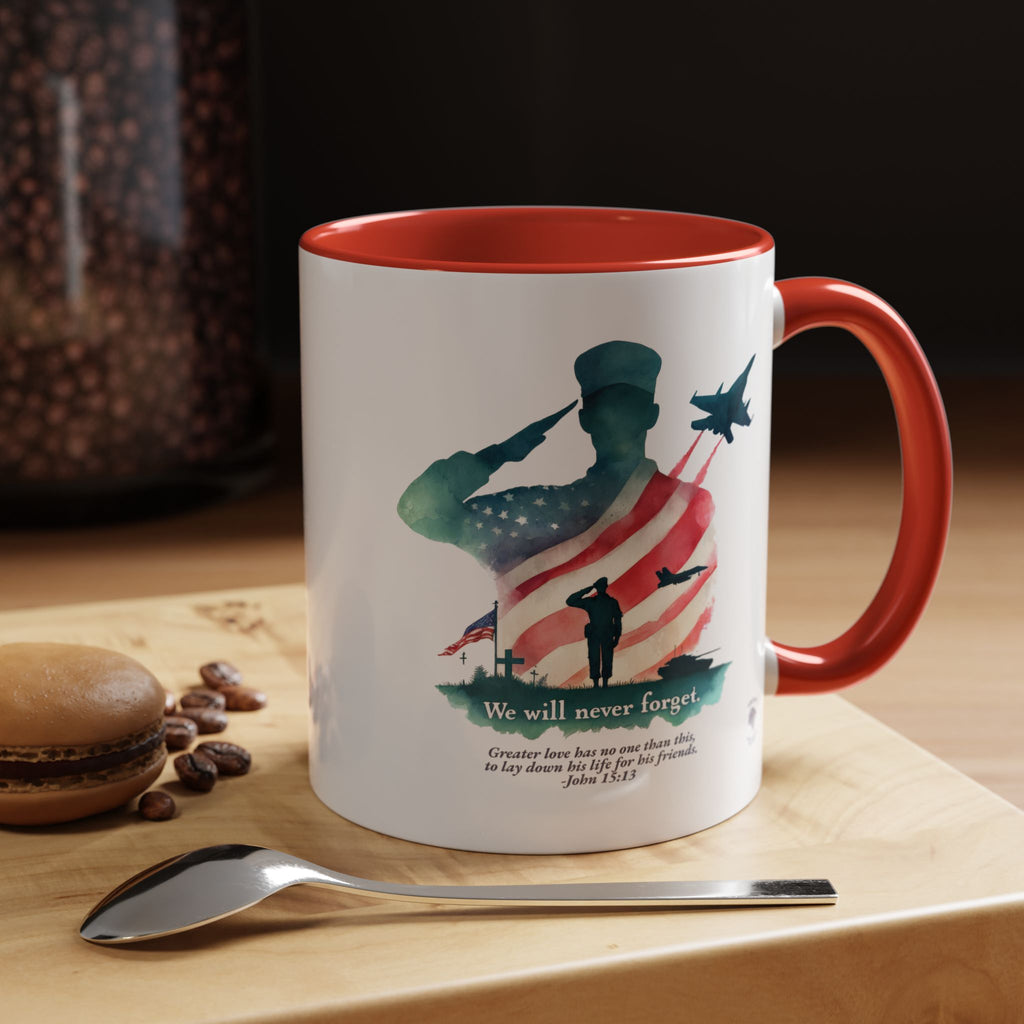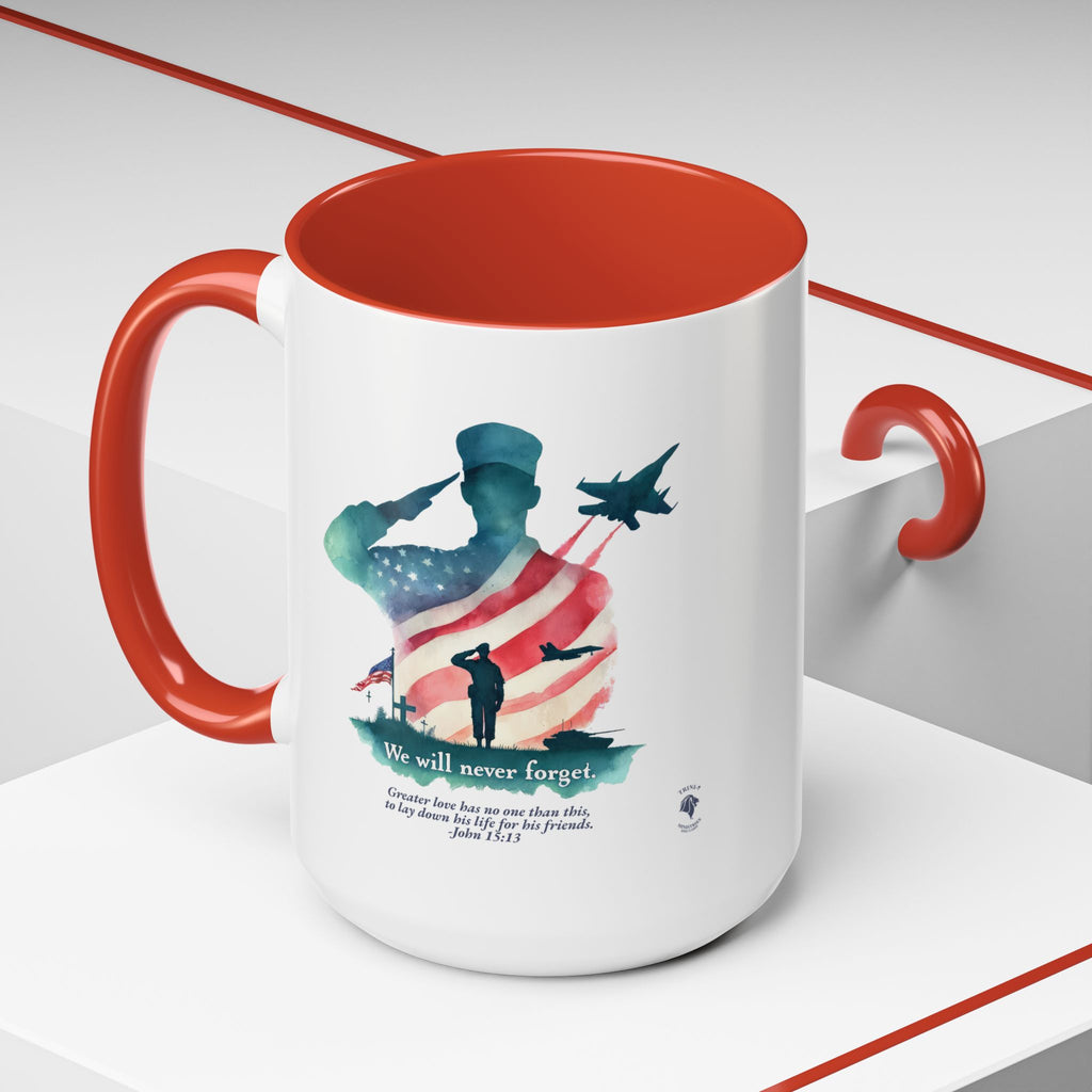 Start your day with a reminder of the sacrifice that secures our freedom—and the greater love that never fades. This bold and meaningful mug features the “Never Forget” design, now wrapped around a high-quality accent-handled mug in your choice of deep navy or bright red. Whether you're sipping coffee during quiet time or honoring loved ones on Memorial Day, this mug is a beautiful way to keep faith and gratitude front and center.