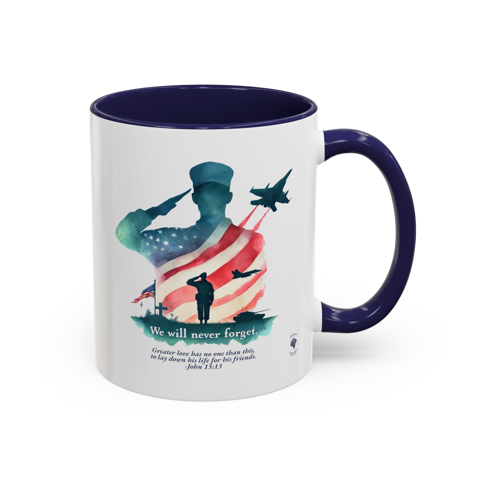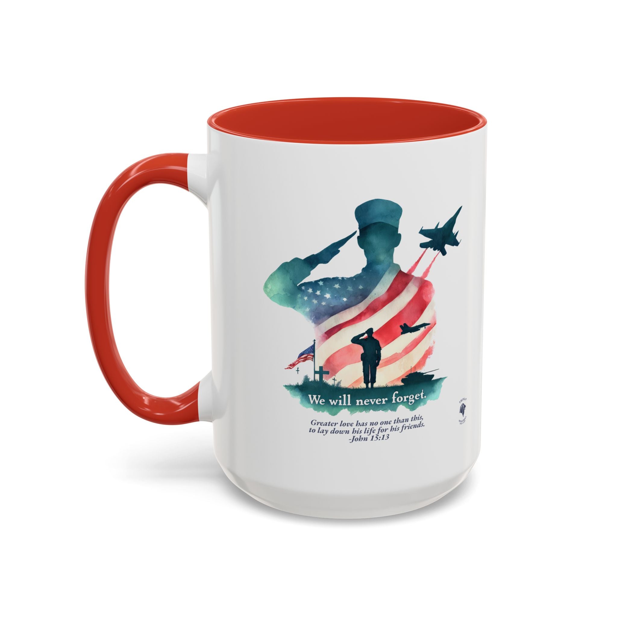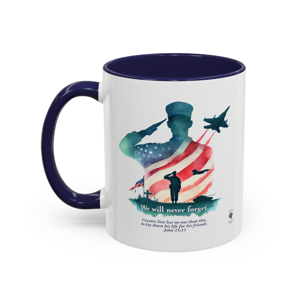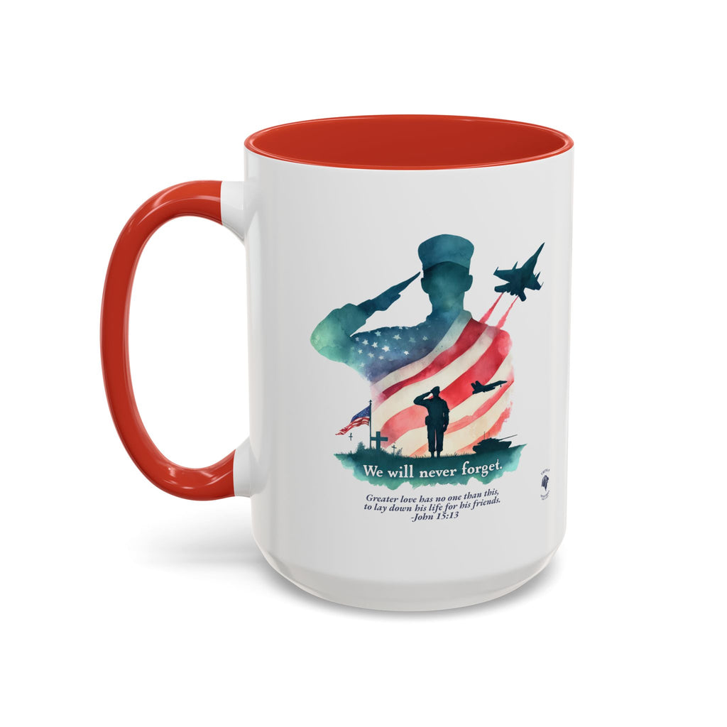 Start your day with a reminder of the sacrifice that secures our freedom—and the greater love that never fades. This bold and meaningful mug features the “Never Forget” design, now wrapped around a high-quality accent-handled mug in your choice of deep navy or bright red. Whether you're sipping coffee during quiet time or honoring loved ones on Memorial Day, this mug is a beautiful way to keep faith and gratitude front and center.