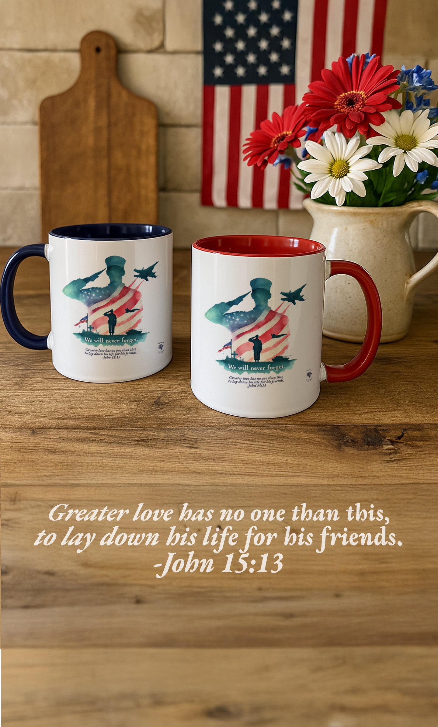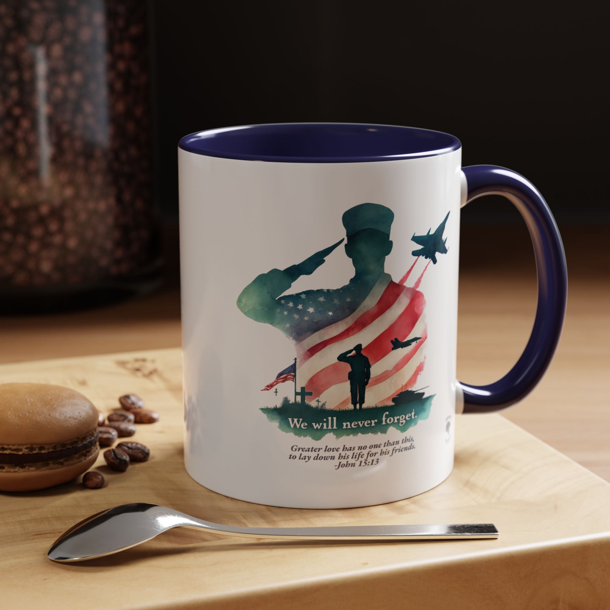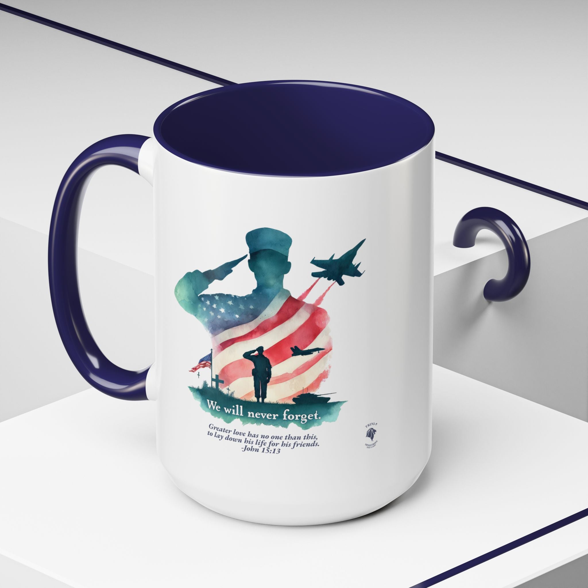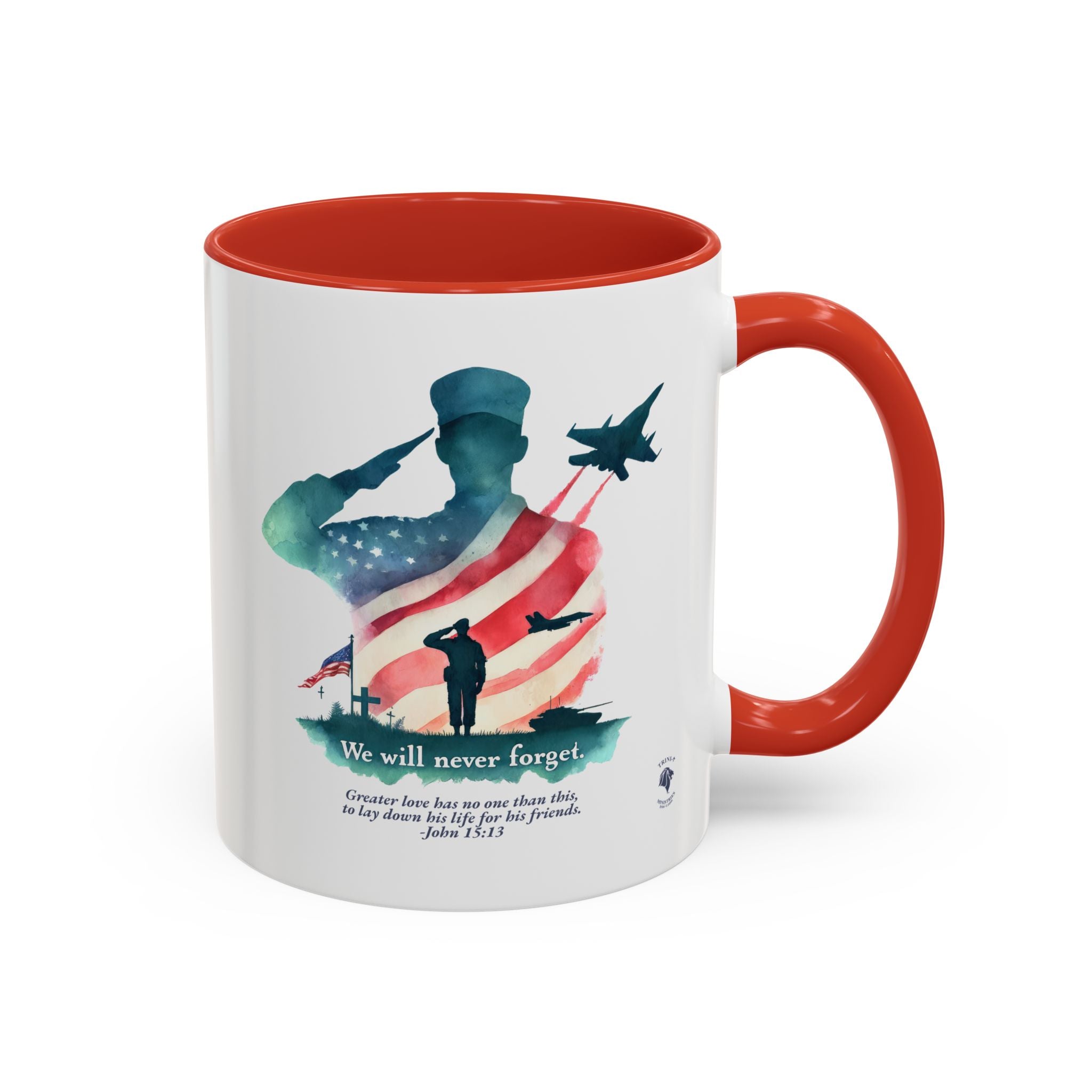 Start your day with a reminder of the sacrifice that secures our freedom—and the greater love that never fades. This bold and meaningful mug features the “Never Forget” design, now wrapped around a high-quality accent-handled mug in your choice of deep navy or bright red. Whether you're sipping coffee during quiet time or honoring loved ones on Memorial Day, this mug is a beautiful way to keep faith and gratitude front and center.